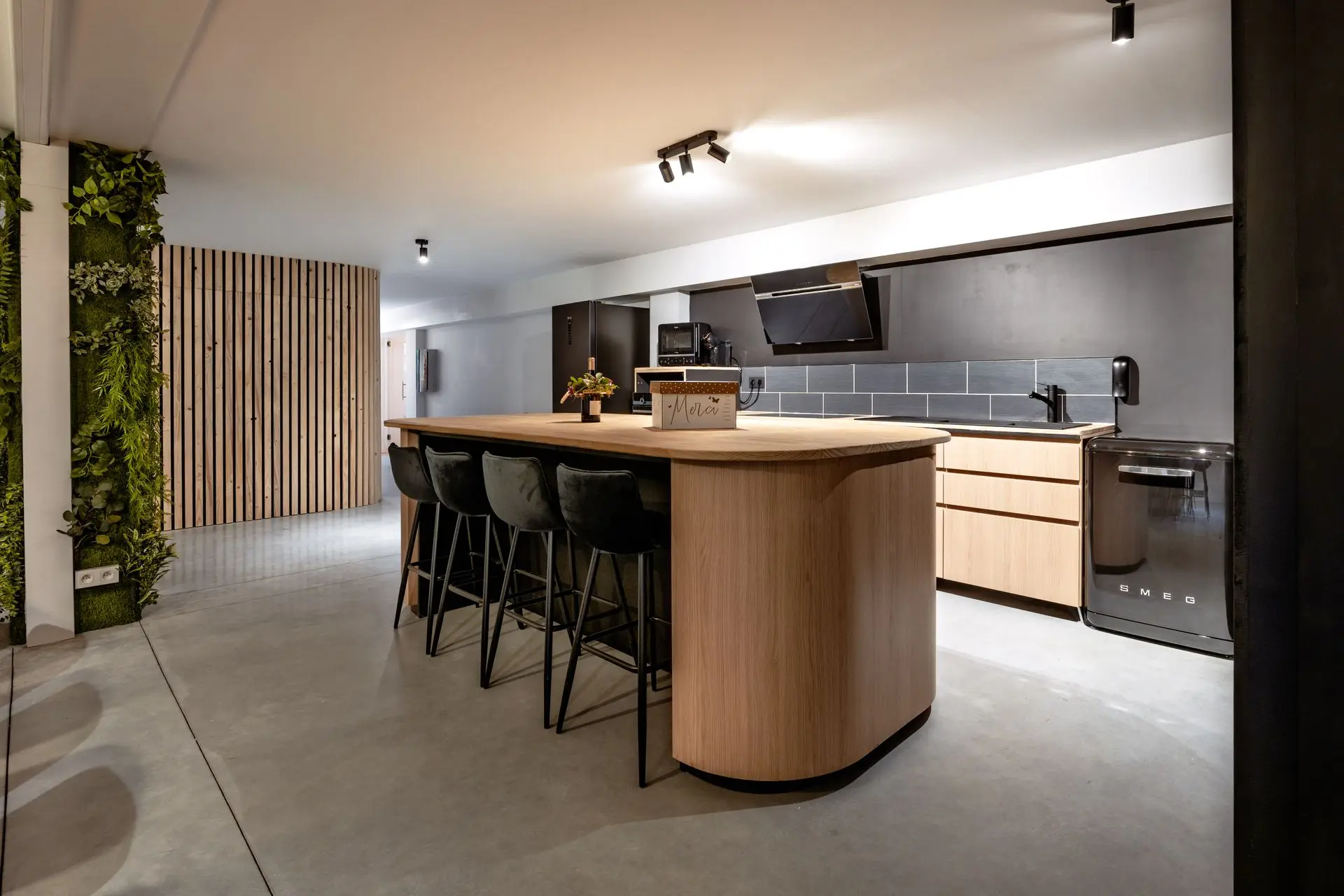 Une salle élégante de 65 m², moderne et déjà équipée (son, image, lumières) avec cuisine ouverte et commodités. Vous installez votre univers, nous vous offrons le cadre.